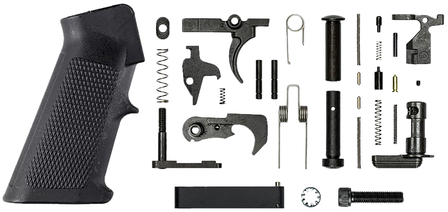 This lower parts kit helps you to build a custom AR15 from the ground up. It features Mil-spec dimensions and coating ensure the highest quality and correct component interface. The kit includes Takedown/pivot Spring, Takedown/pivot detent, Trigger/hammer pin, Takedown pin, Pivot pin, Bolt Catch/spring, buffer, and roll pin, safety selector/spring and detent, buffer retainer and spring, trigger guard and roll pin, A2 pistol grip/screw and lock washer, hammer and disconnector spring, magazine catch body/spring and button, hammer, trigger and a disconnector.