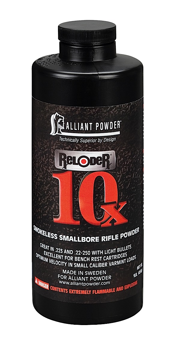 Alliant’s Reloder 10x Powder is for light bullet applications in .222 Rem, .223 Rem .22-250 Rem and key bench rest calibers. Also great in light bullet .308 Win loads. Optimum velocity in small caliber varmint and light bullet loads.