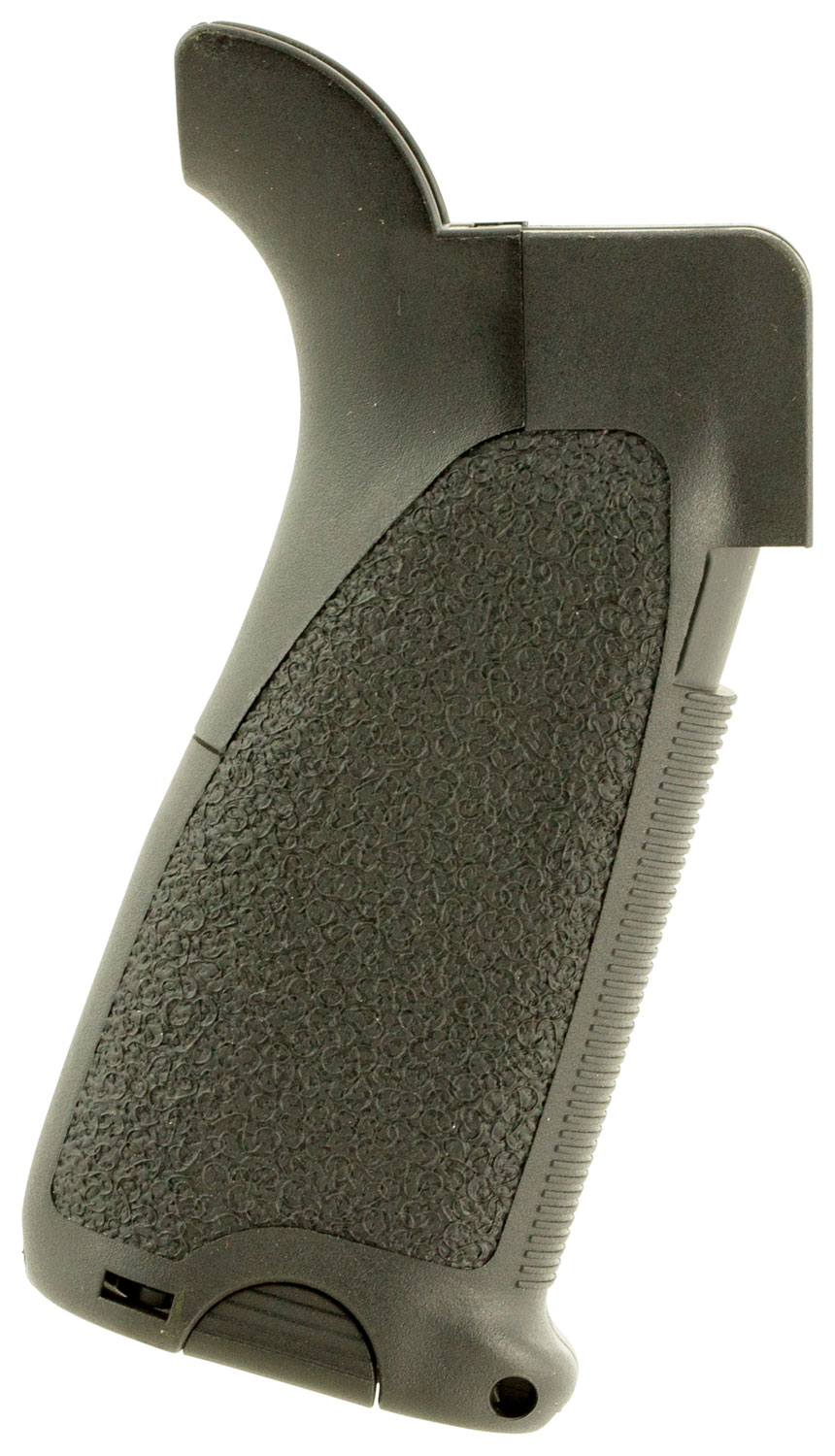 This AR-15 grip reduces grip angles which keeps wrist in line with trigger for improved ergonomics and trigger control. It features interchangeable inserts for either a smooth front strap or a “duckbill” to cover trigger guard gap, and backstraps for various hand sizes, weapons, and grip positions. The grip comes with a hinged trap door with interior storage compartment and water resistant rubber gasket.