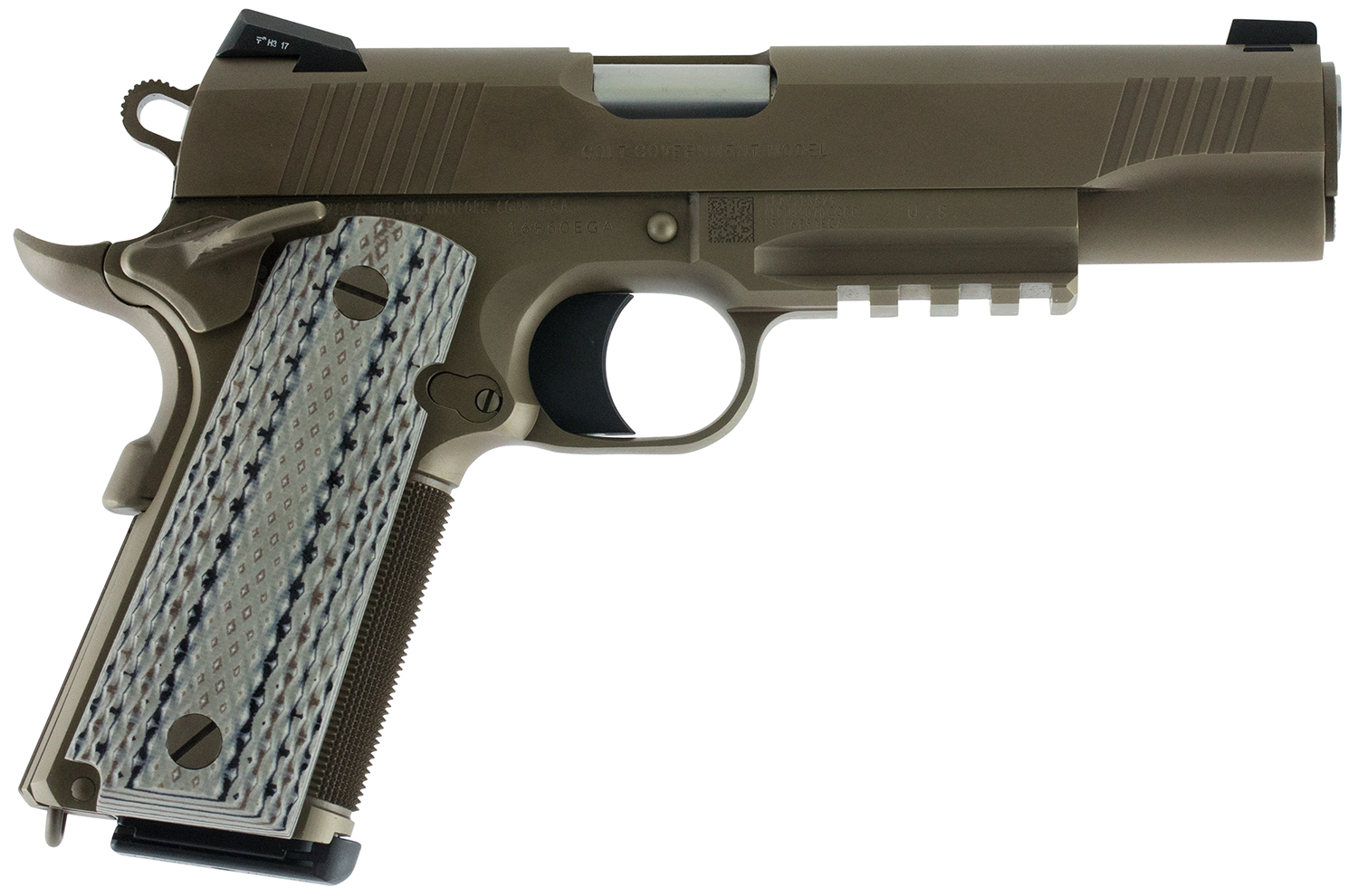 Colt Mfg O1070CQB Limited Edition Government 45 ACP 8+1, 5″ Stainless National Match Barrel, Desert Sand Serrated Steel Slide & Frame w/Picatinny Rail, Scalloped Gray G10 Grip, Ambidextrous