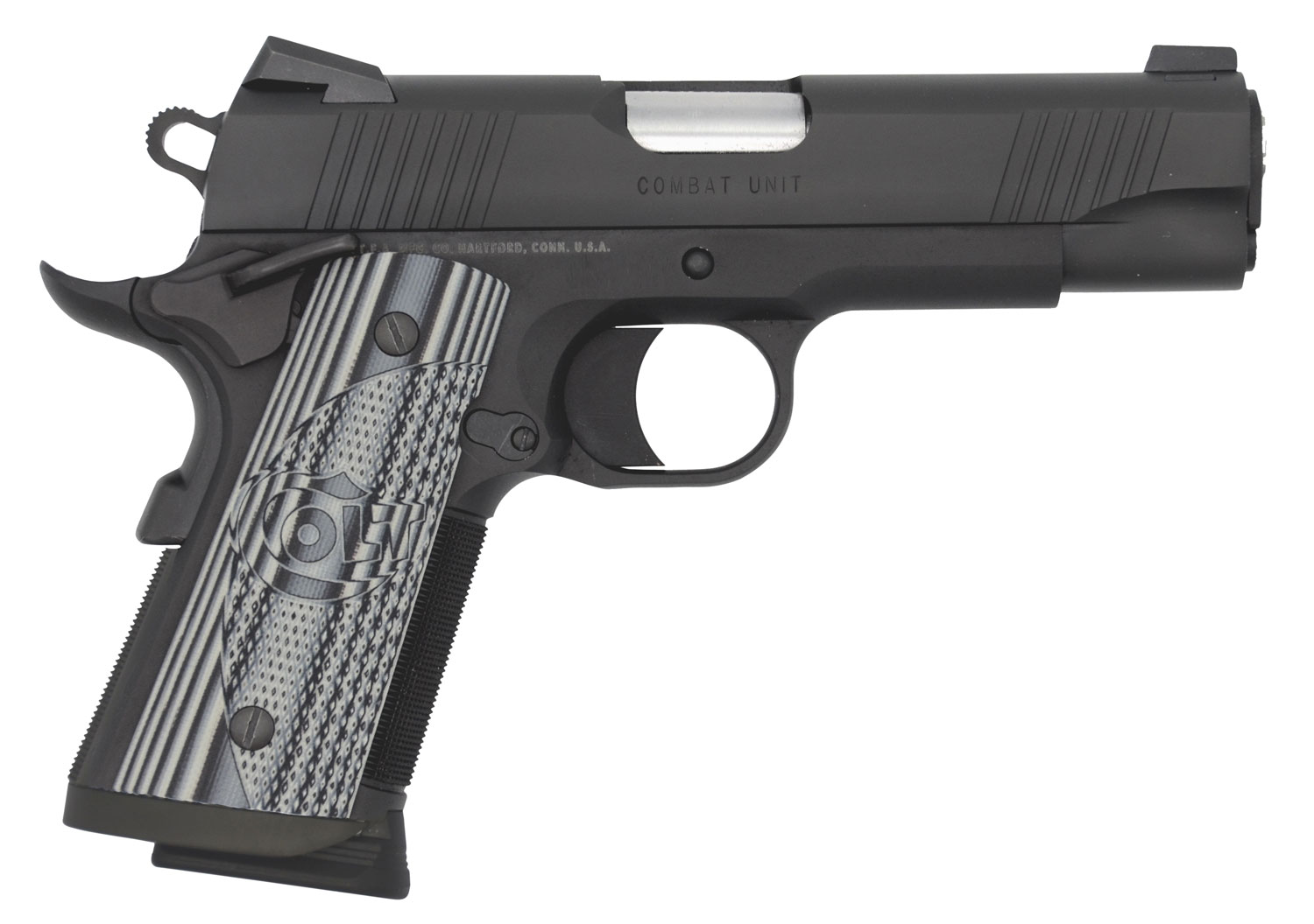 The Colt Combat Unit design was guided by US Special Forces Trainers whose tactical expertise delivered a gun equipped to handle and shoot with the highest levels of control, accuracy and reliability. The pistol features a compact, anodized aluminum frame; Commander length slide for discreet carry; custom G10 grips and 25 LPI checkering provide steady traction; undercut trigger guard; upswept beavertail safety; front and rear angled slide serrations; extended magwell; Novak sights; Series 80 firing system and National Match barrel.