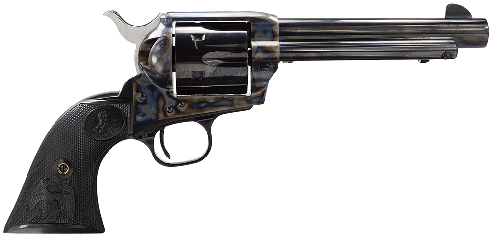 The Colt Single Action Army revolver, the Peacemaker, was originally introduced in 1873–no more sculptural and practical Colt has ever been created. This revolver features a polished spur hammer, black composite eagle stocks, and 2nd generation-style cylinder bushing.