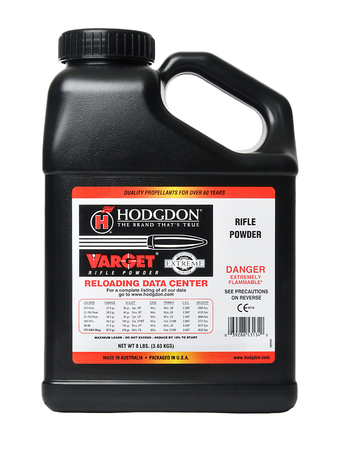 The first of Hodgdon’s revolutionary smokeless Extreme Extruded Powders, Varget features small extruded grains for uniform metering, insensitivity to hot/cold temperatures and higher energy for improved velocities over other powders in its burning speed class. Easy ignition and clean burning characterize other features that translate into superb accuracy, higher scores and more clean, one shot kills. The perfect powder for competitive Match shooting 223 Remington and heavy bullets, Varget also offers outstanding performance and velocity in other popular cartridges such as 22-250 Remington, 308 Winchester, 30-06, 375 H&H and many more.
