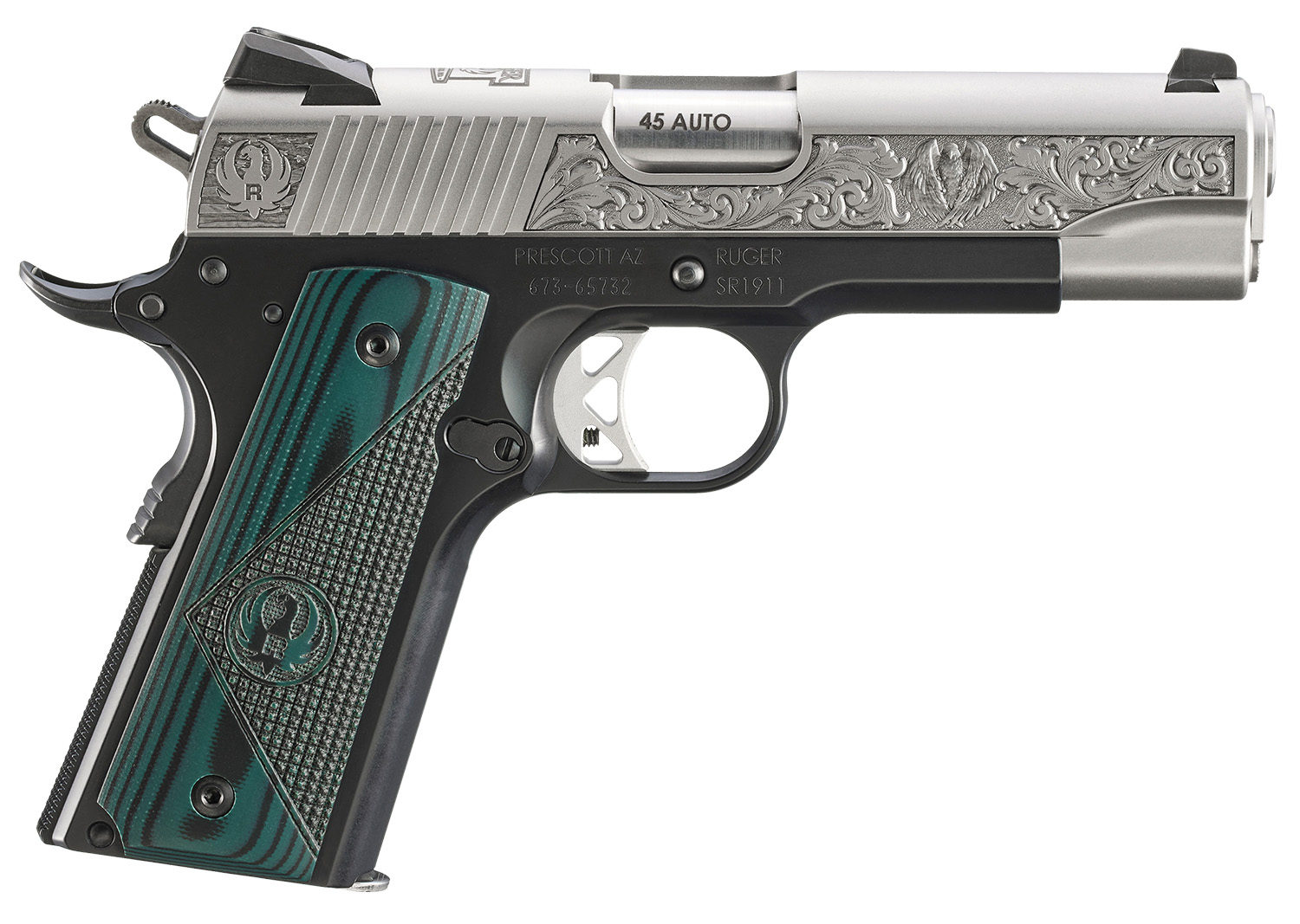 The Ruger SR1911 Mayodan, NC Edition models production will be limited to 500 total units. Featuring an engraved stainless steel slide with bald eagle on the sides with the Ruger logo and “271 Cardwell Rd.” adorned on the top of the slide; lightweight aluminum frame and polished titanium feed ramp; positive barrel lock-up; replaceable grip panels and checkered backstrap; skeletonized trigger, skeletonized hammer and titanium firing pin for faster lock time; oversized beavertail grip safety, extended thumb safety and slide stop lever; oversized ejection port and extended magazine release; inspection port allows for visual confirmation of a loaded or empty chamber and a flat mainspring housing and rear slide serrations for a positive grip. Accepts most standard, aftermarket 1911 parts and accessories.Includes two 7rd stainless steel magazines and bushing wrench.