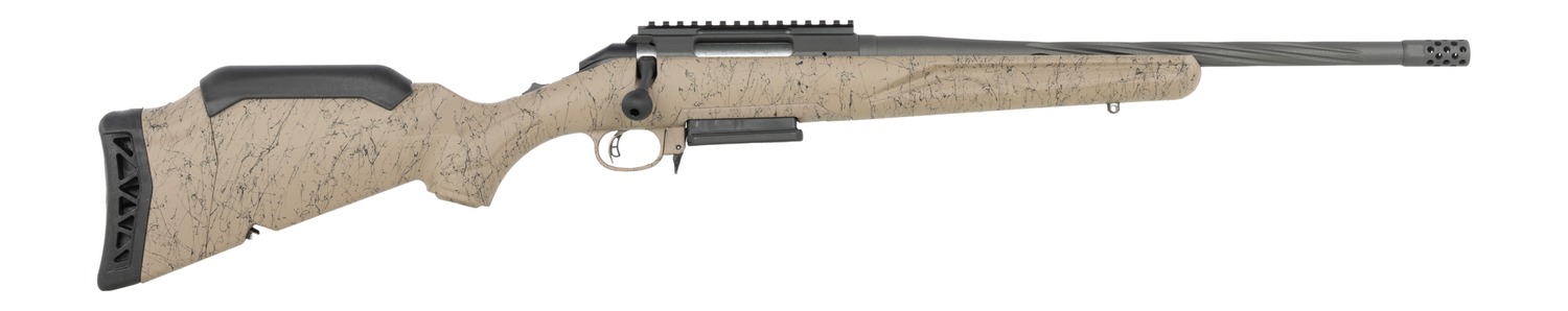 Sports South Exclusive. The Ruger American Ranch GenII features a splatter finished stock with a soft rubber recoil pad, removing the installed spacer allows for length of pull to be adjusted from 13.75″ to 12″; installed low comb improves sight alignment when using magnified optics but can be removed when utilizing low-mounted sights; Cerakote coating on barrel, muzzle brake, receiver and bolt handle results in a durable, easy-to-maintain finish; compact, threaded barrel with factory-installed Ruger Hybrid Muzzle Brake is cold hammer-forged; Ruger Marksman Adjustable trigger; patented Power Bedding integral bedding block system positively locates the receiver and free-floats the barrel for outstanding accuracy; one-piece bolt is CNC machined from stainless steel for smooth operation and the familiar three-lug design with 70 degree throw provides ample scope clearance; oversized bolt handle for positive bolt manipulation; installed Picatinny scope base. Includes magazine and steel sling swivel studs.