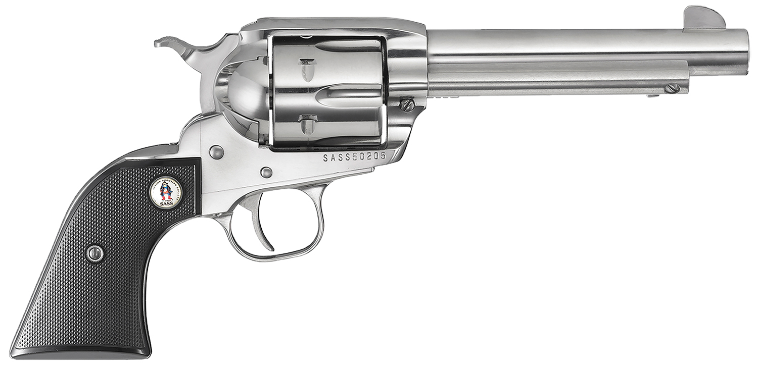 Ruger’s Vaquero features a handsome, larger crescent-shaped ejector rod head that boasts traditional form, which makes it perfect for every cowboy or cowgirl. Its patented reverse indexing pawl allows for easier loading and unloading, while the traditional beveled cylinder simplifies holstering. The transfer bar mechanism and loading gate interlock provide an unparalleled measure of security against accidental discharge. The Vaquero also has a traditional western-style, hand-filling grip and a cold hammer-forged barrel. SASS models have black, checkered grips featuring the SASS logo, Montado-style hammer, and a high-gloss stainless steel metal finish. This revolver is sold as a two-gun consecutive serial number set with “SASS” prefix, shipped together in same commemorative case. It must be purchased with SS# 69517.