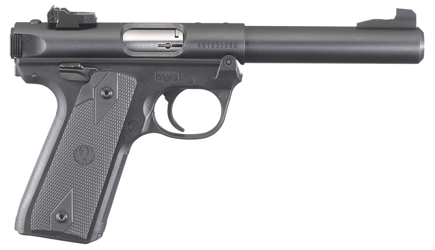Ruger Mark IV 22/45 22 LR 10+1, 5.50″ Stainless Bull Barrel, Blued Drilled & Tapped Steel Receiver & Polymer Frame, Black Checkered Polymer Grip Ambidextrous