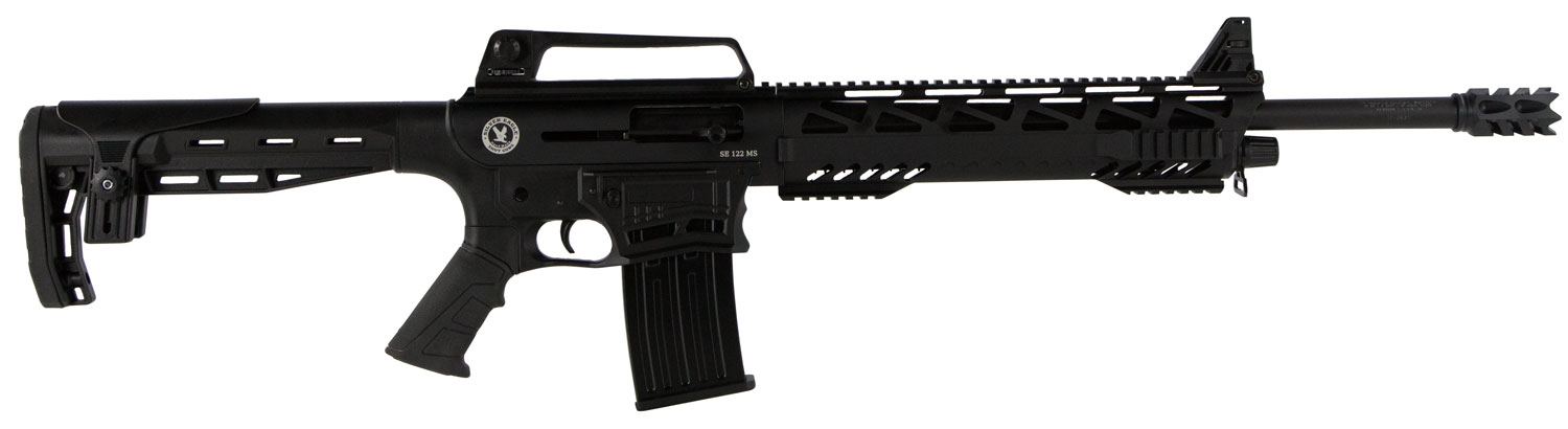 Built on the SE122 frame, the SE122 Tactical shares important characteristics, including a strong but sensitive gas system that cycles reliably with a wide range of loads, and an action bar milled from solid steel. It utilizes an ingenious, self-adjusting gas valve which is a versatile gas system, assuring reliable operation. The SE122 Tactical also features a fiber optic adjustable front with adjustable rear sights, carry handle, quad Picatinny rail, adjustable comb, sling attachment points, and a muzzle brake. It ships in a hard case with 2 and 5 shell magazines. This 12 gauge model has an 18.5″ barrel and matte black finish.