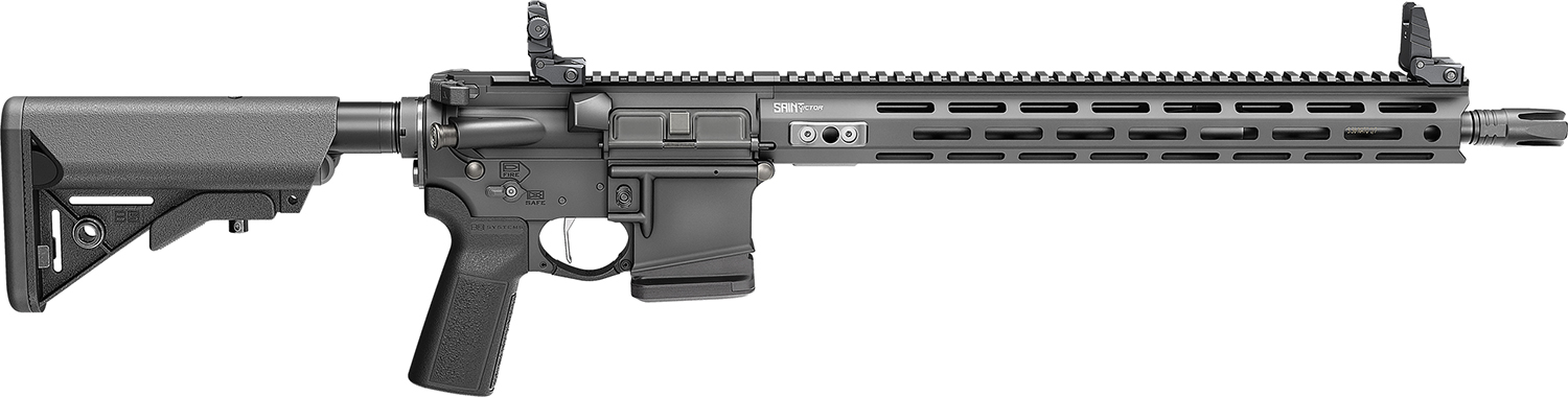 The Saint Victor features a free float aluminum handguard w/SA locking tabs and M-LOK; B5 Systems Enhanced SOPMOD stock; Mil-Spec receiver extension; B5 Systems Type 23 P-Grip; Radian Raptor Ambidextrous charging handle; QD receiver end plate; 45-degree ambidextrous safety; B5 systems polymer trigger guard and a pinned & 4-Prong flash hider. Includes one 10rd Magpul PMAG Gen M3.