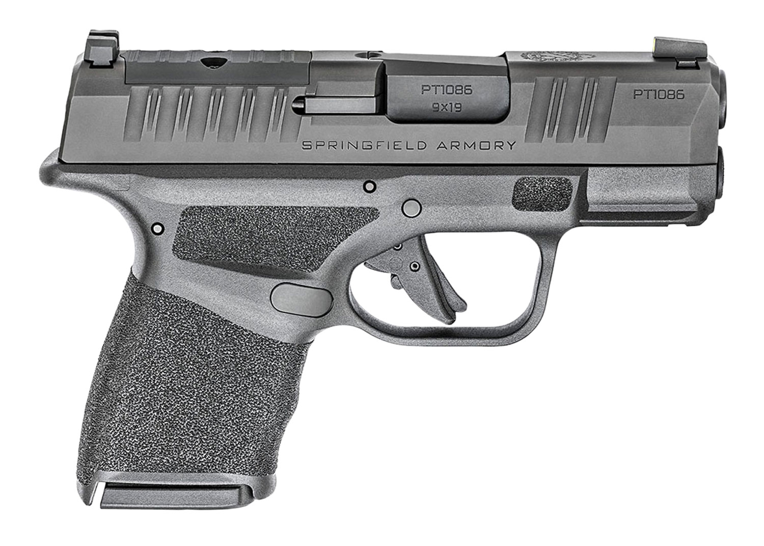 Springfield Armory micro-compact Hellcat features unique top slide serrations to maximize your grip on the slide; non-proprietary accessory rail allows you to accessories with your favorite light and/or laser; Tritium/Luminescent front sight, Tactical Rack U-Notch rear sight; reversible mag release, loaded chamber indicator and custom pressure activated grip texture. Includes 2 magazines and pistol case.