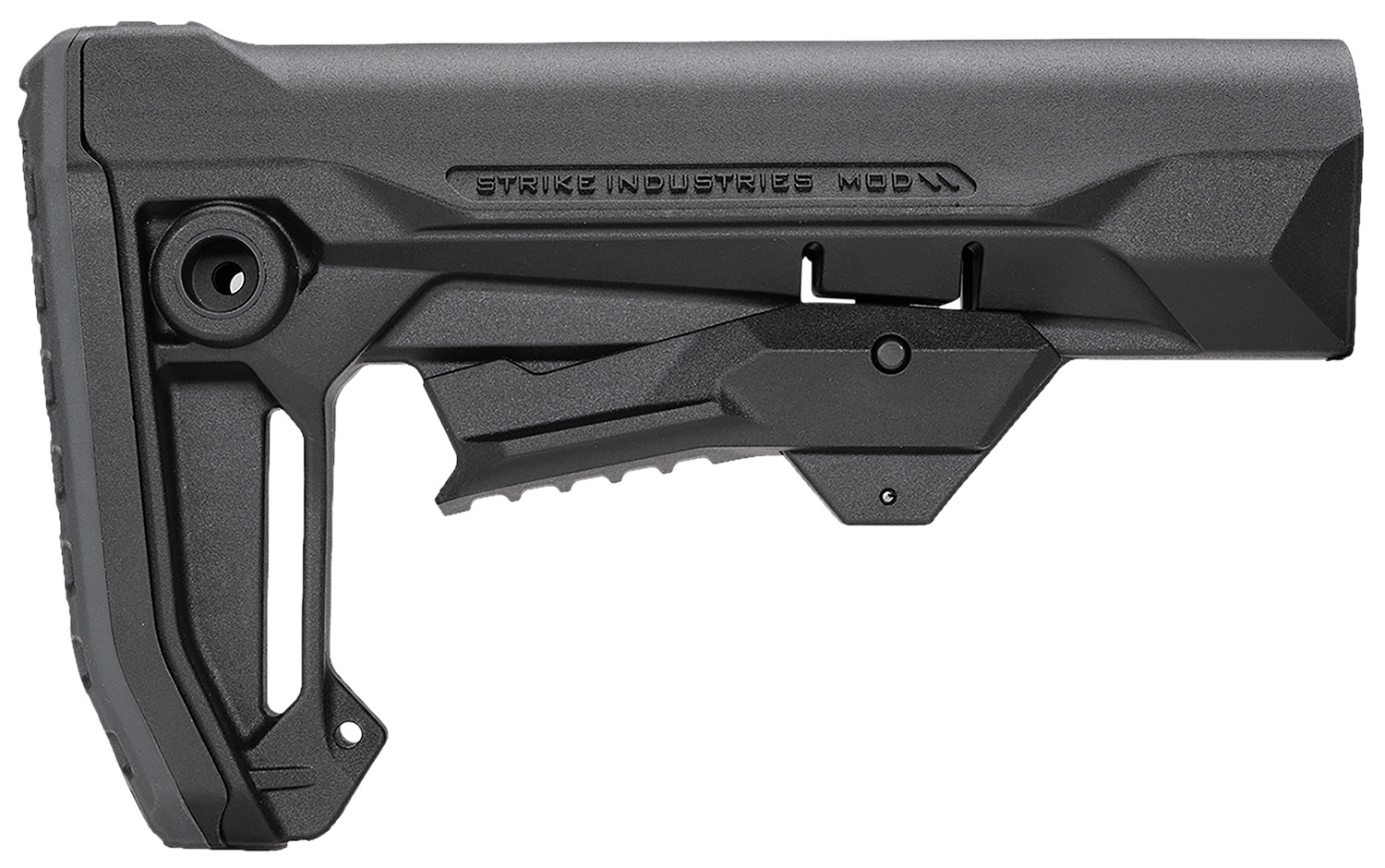 Introducing the Strike Industries MOD2 Rifle Stock. With a wider cheek rest and overmolded rubber buttstock pad, shooters can really dig into their shoulders for a more comfortable and stabilized shooting experience. For ease of adjusting length of pull, there is a larger lever with large textured accents for a solid grip, reducing the chance of slipping when using under pressure. That same lever is also used to install the MOD2 stock onto the buffer tube, or remove. Pull the front of the lever downwards to install over the buffer tube with ease. Overmolded QD points are available on both side of the MOD2 stock.