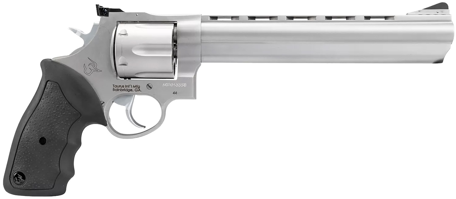 Taurus 2-440089 44 Large 44 Rem Mag 6 Shot 8.37″ Matte Stainless Ported Barrel, Cylinder & Frame, Black Finger Grooved Rubber Grip, Transfer Bar Safety, Exposed Hammer