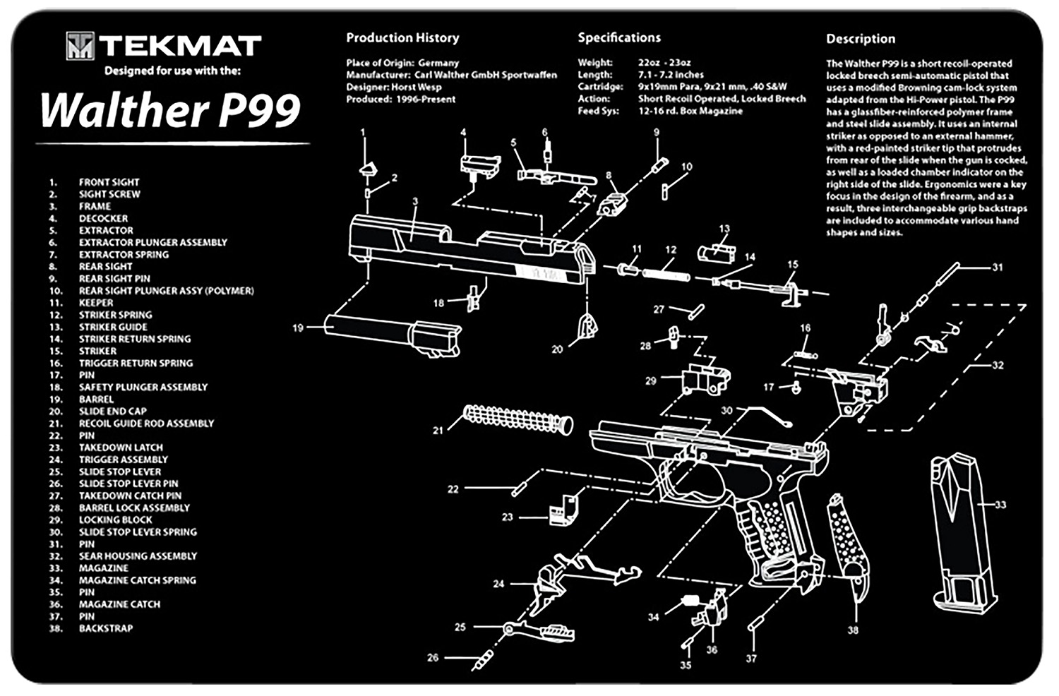 TekMat TEKR17WALP99 Walther P99 Cleaning Mat Black/White Rubber 11″x17″ Walther P99 Parts Diagram