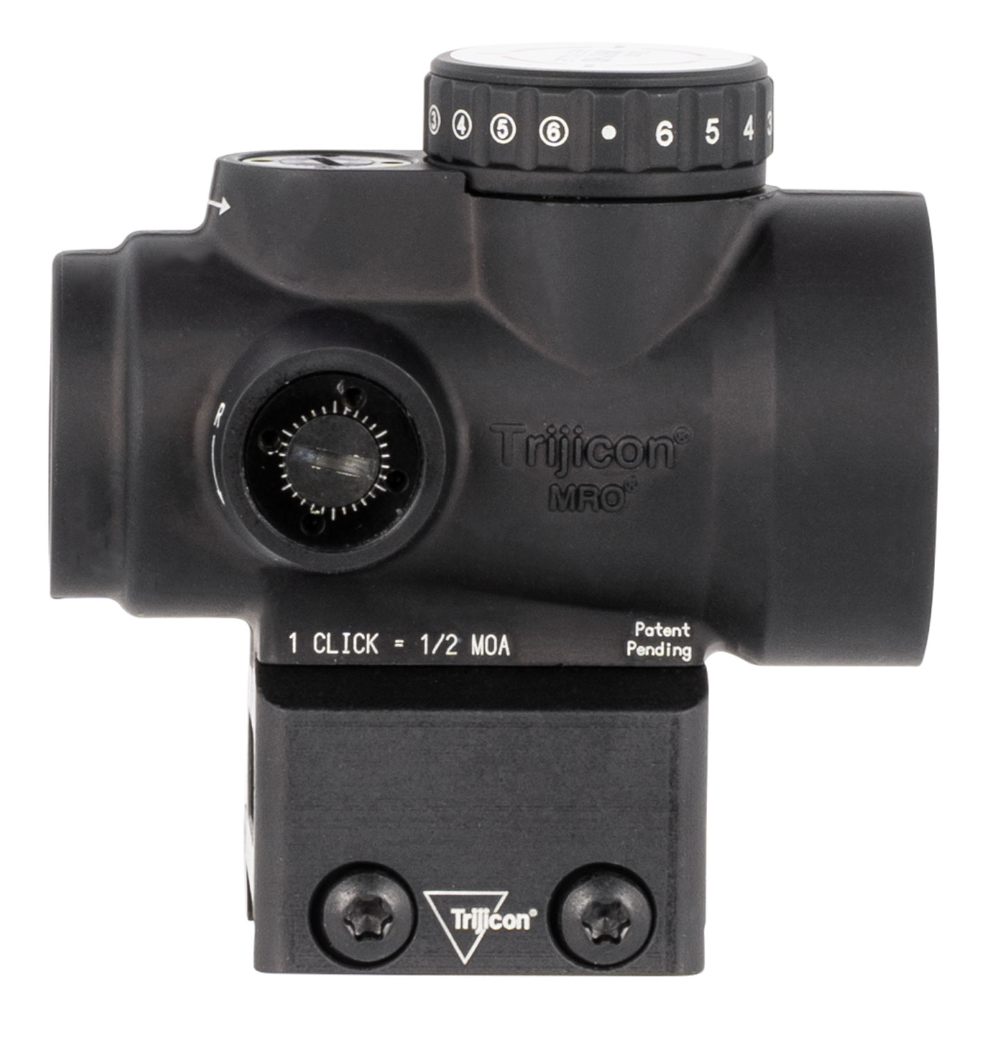 The Trijicon Miniature Rifle Optic (MRO) is a reflex-style, sealed sight intended for use on rifles, carbines, and shotguns to provide fast target acquisition. It is designed to be used with both eyes open, providing the operator with maximum situational awareness. The large aperture and tapered light path maximizes the viewing area in such a small optic, allowing for fast target engagement especially from non-standard shooting positions. It also features ambidextrous brightness controls, sub-flush adjusters, advanced lens coatings, and a fully sealed, waterproof, hard anodized forged 7075-T6 housing, making the MRO the ultimate mini reflex sight. The MRO HD is optimized for use with a magnifier, with a re-engineered objective lens to produce a refined 2.0 MOA center dot surrounded by a 68 MOA segmented circle reticle. The ambidextrous reticle and brightness control allows the user to choose between a full reticle or center dot only.